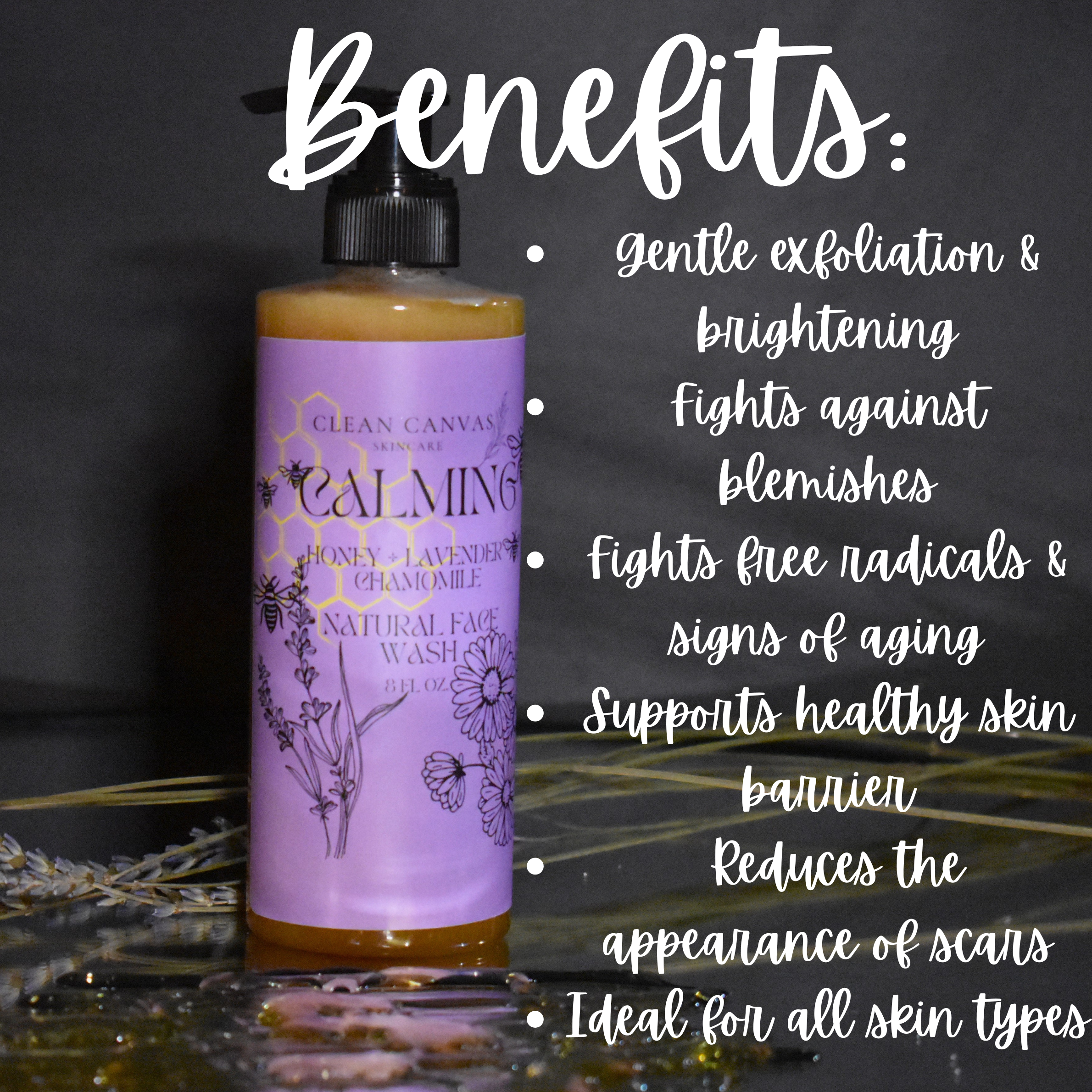 Indulge in the calming power of nature with this luxurious honey, lavender, and chamomile face wash. Formulated with honey—an ancient beauty secret—this cleanser can help gently exfoliate, brighten, and clarify the skin, revealing a smoother, more radiant complexion. Known for its potential acne-fighting properties, honey can help reduce the appearance of scars, even out skin tone, and support a healthy skin barrier while promoting elasticity.