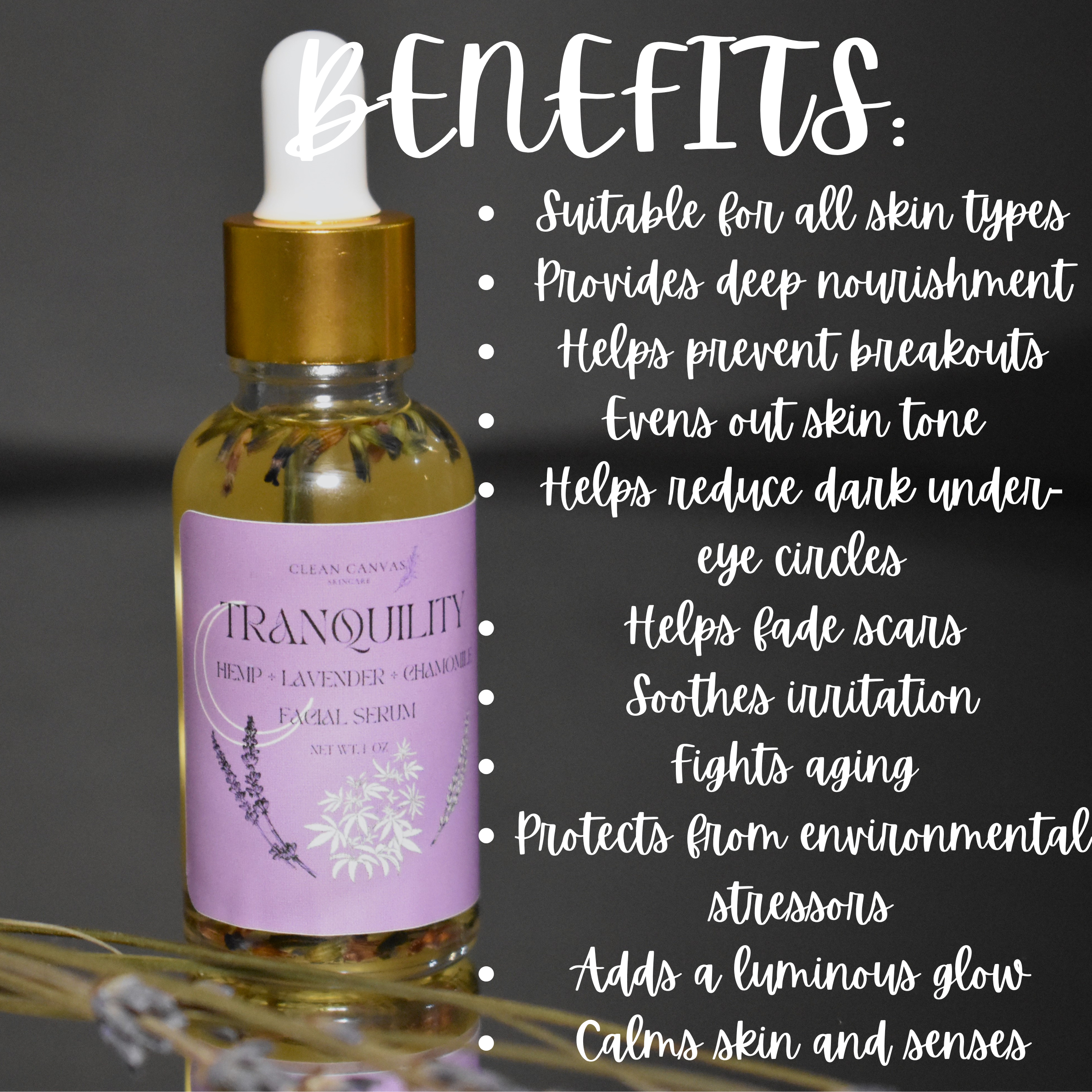 Infused with the calming essence of lavender leaves, our Tranquility Facial Serum brings you the ancient beauty secret cherished by the Romans, where lavender originated. Known for its rejuvenating properties, lavender helps regenerate skin cells faster, reducing the appearance of dark circles and fine lines. With its natural ability to soothe and balance, it works to prevent premature aging while leaving your skin feeling calm, refreshed, and radiant. Experience the serenity and glow that lavender has brought to beauty rituals for centuries.